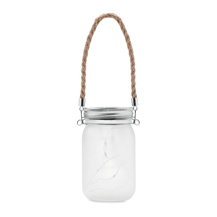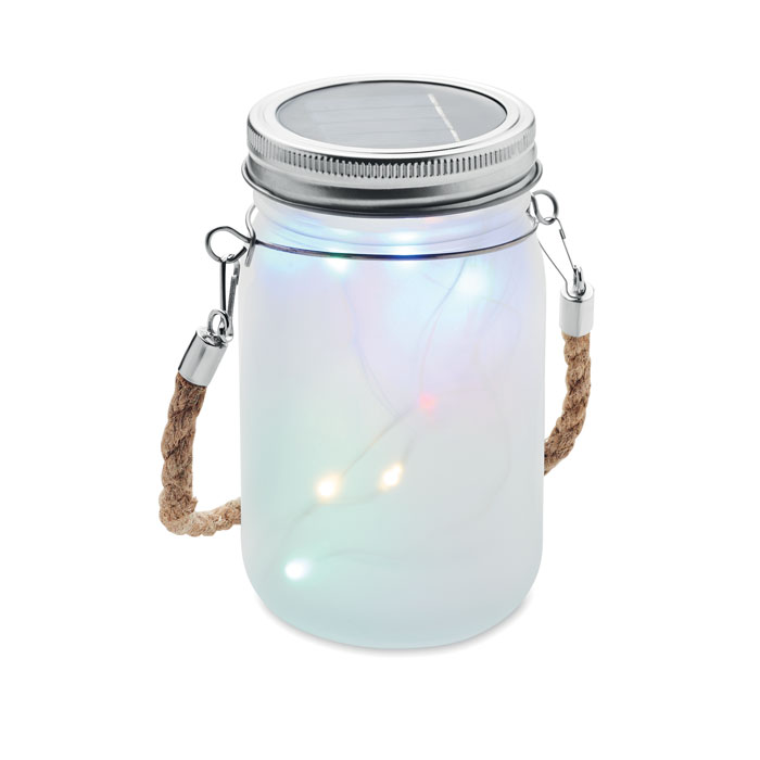 Solar mason jar outdoor lamp in soda-lime glass with 20 LED fairy string lights in assorted colours. Hanger on top. Approx. 7 hours working time. Battery 600 mAh and 1 NI-MH included. IP44.